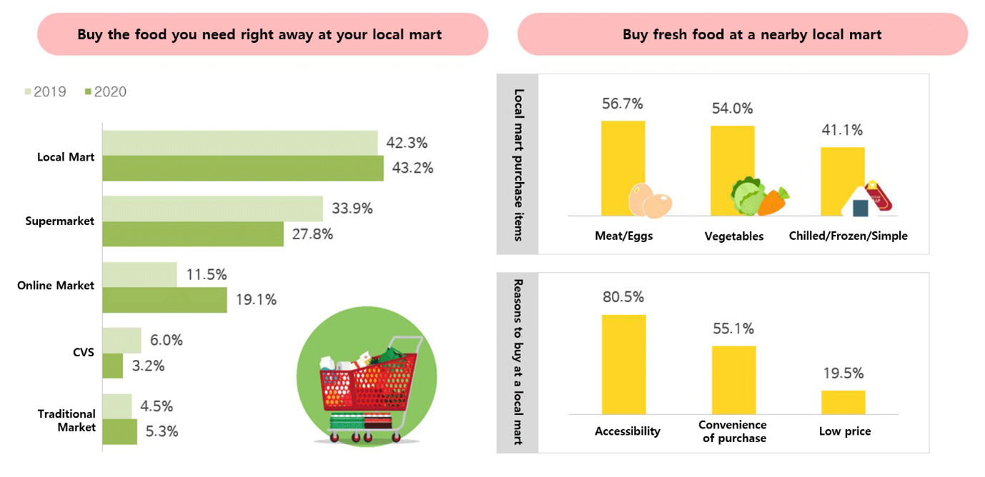 In the ROMARKET's survey on local supermarkets, it turned out that consumers prioritize accessibility to stores and convenience in purchasing. We came up with possibilities in the fact that necessities such as groceries and fresh foods that are immediately needed are being purchased at nearby local supermarkets rather than large retailers due to convenience.