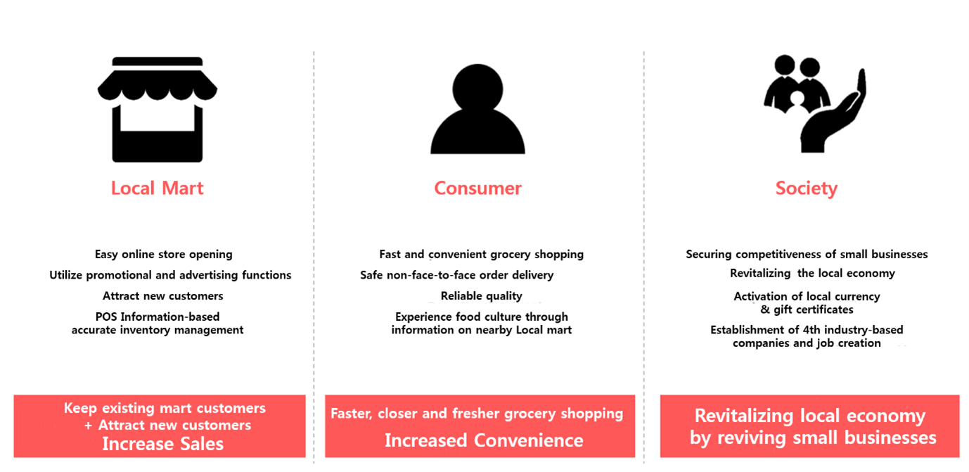 <table data-full-width="true"><thead><tr><th>ROMARKET</th><th>Needs</th><th>Local Supermarket</th></tr></thead><tbody><tr><td></td><td><p><strong>Continuous increase in single-person households</strong></p><p>Small-package, single-use products than bulk products</p></td><td>Small-packaged food ingredients</td></tr><tr><td></td><td><p><strong>‘Homeconomy’ trend</strong></p><p>Needs for simple cooking products and groceries</p></td><td><p>The freshest products such as vegetables, fruits, meat, etc.</p><p>Selection of products that meet the needs of local residents</p></td></tr><tr><td><p>A supermarket platform that allows order/payment/delivery</p><p>GPS-based local supermarket is available</p></td><td><p><strong>Changes in consumption patterns</strong></p><p>Order/payment/delivery are all made in one place</p></td><td></td></tr><tr><td>Online/Contact-free platform specializing in local supermarkets</td><td><p><strong>Changes in the distribution market due to COVID-19</strong></p><p>Increase in e-commerce sales</p><p>Needs for contact-free order/payment channels</p></td><td></td></tr><tr><td></td><td><p><strong>Delivery Culture</strong></p><p>Fast delivery</p></td><td><p>From the supermarket in front of my house</p><p>(Delivered within an hour on average)</p></td></tr></tbody></table>